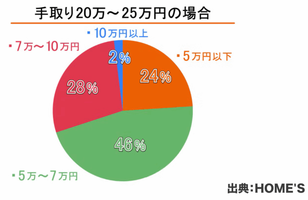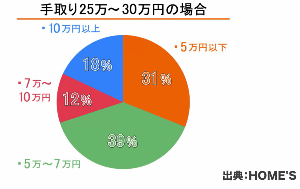 手取り20万〜25万円の層でも、5万円以下と5万〜7万円の家賃を支払う人の割合が大きく、25%以下の負担率を維持している人が多数を占めています。