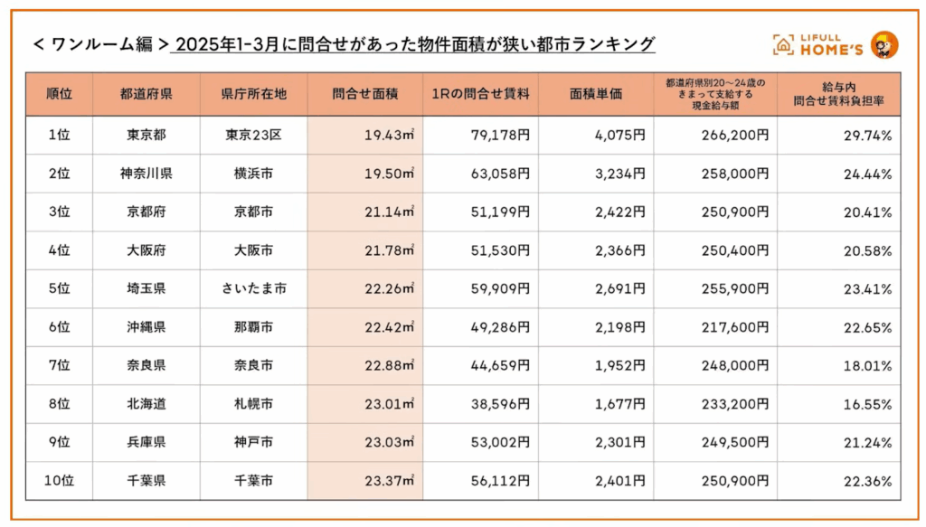 ホームズが発表したワンルームのデータを見ると、東京だけが突出して30%近い負担率となっています。神奈川で25%程度、その他の地域は概ね20%程度で推移しており、東京以外では比較的健全な水準を維持していることがわかります。