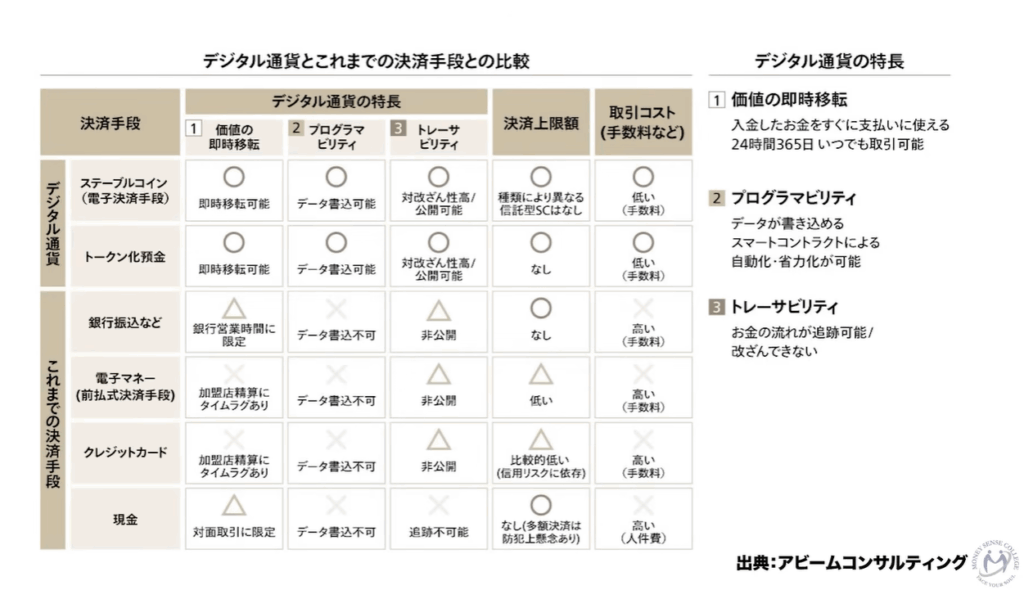 一方、ステーブルコインであればトークンを渡して、それがインターネット上で取引され、各国通貨に変換できます。日本円に紐づいたもの、アメリカドルに紐づいたものというように、海外取引においてはステーブルコインがやりやすく、国内取引においてはトークン化預金がやりやすいという特徴があります。