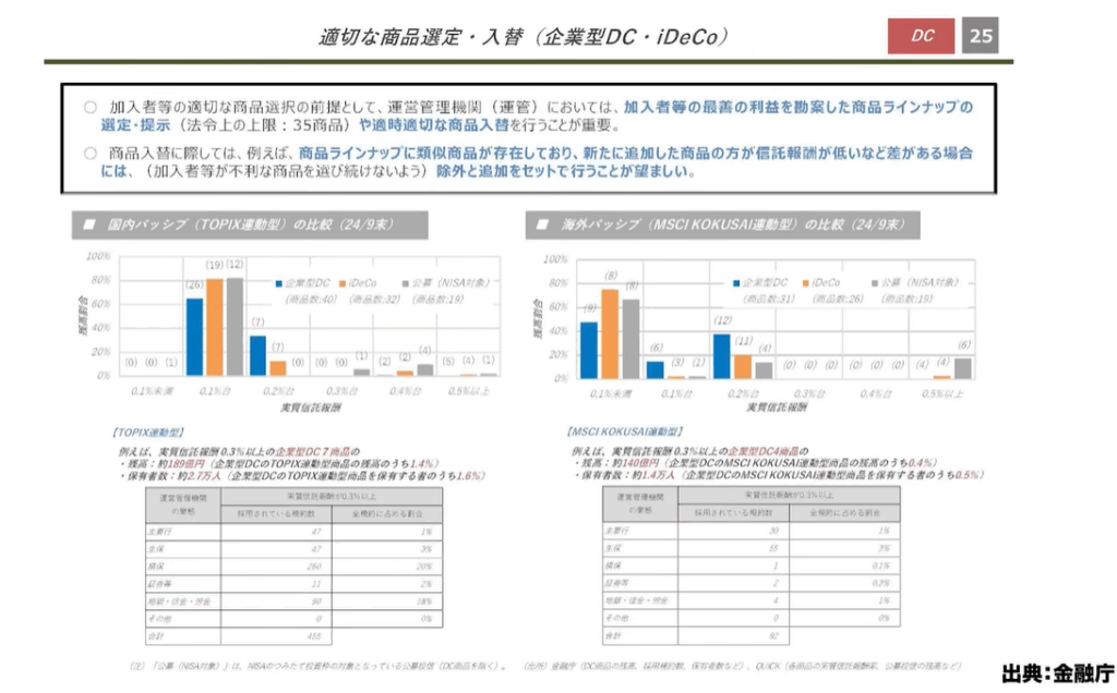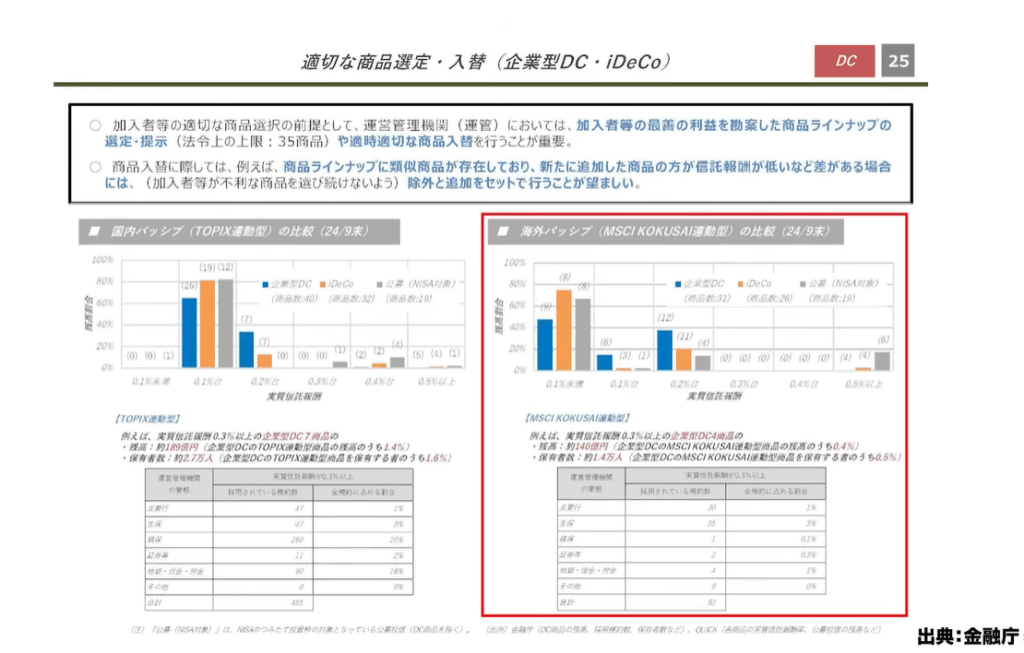 適切な商品選定も行われていません。TOPIXに連動するインデックスファンドで、実質信託報酬が0.3%以上のものが、保険会社では約20%、地方銀行や信用金庫では約18%も存在します。