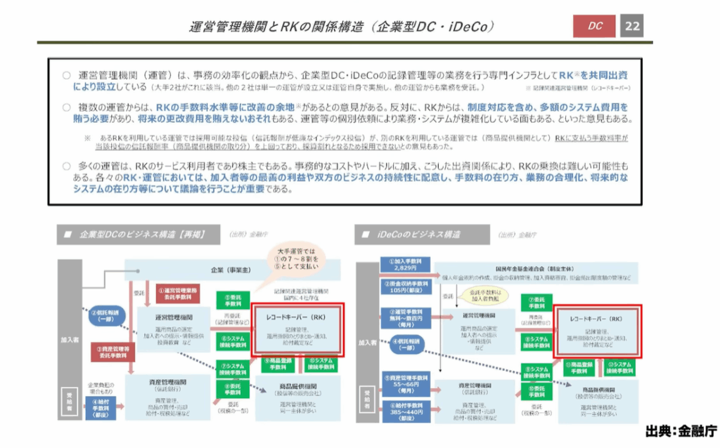 iDeCoにも同様の問題があります。加入者が支払う手数料の7割から8割は、記録管理を担うレコードキーパーに流れています。レコードキーパーは運営管理機関が拠出して設立されており、互いに余裕がない状態です。