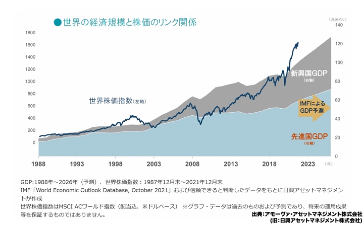 では投資は何に比例するのでしょうか。それはお金を投じていた時間の長さです。投資している期間の長さに比例していくのです。世界の経済規模と株価はリンクしています。GDPの成長と株価の成長は完全に一致するわけではありませんが、どちらも右肩上がりに指数的に上がっているという歴史的な事実があります。GDPは付加価値の総和であり、その付加価値を生み出しているのが企業です。経済規模が拡大していくことに応じて株価も上がっていくと言えます。