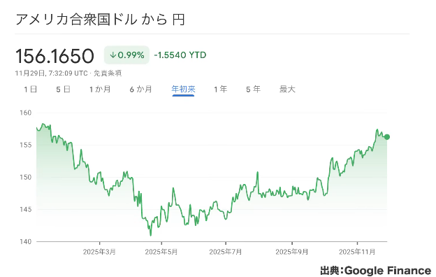 11月29日現在の為替状況を見ると、チャートはV字のような形を描いています。140円台に一度タッチしたのは2025年の初頭、4月頃でしたが、その後再び円安に向かいました。特に高市政権が発足してからの円安が加速しており、現在は160円を見据えたような動きになっています。