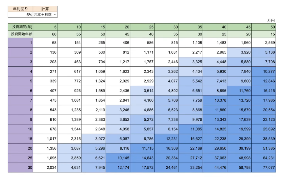 具体的なシミュレーションを見ていきましょう。年利5%で運用すると仮定します。これはインフレも考慮した数字で、長期的な全世界株式投資で十分達成可能な水準です。