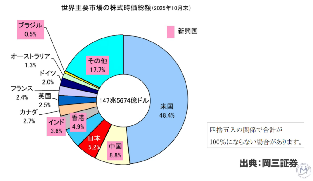 まず市場規模から見ていきましょう。積立投資をしている方の多くは、世界株式やアメリカのS&P500に投資していると思われます。世界の主要市場の株式時価総額は、2025年10月末現在で約2京2135兆円に達しています。昨年は1京8000兆円だったため、1年で4000兆円以上も伸びたことになります。