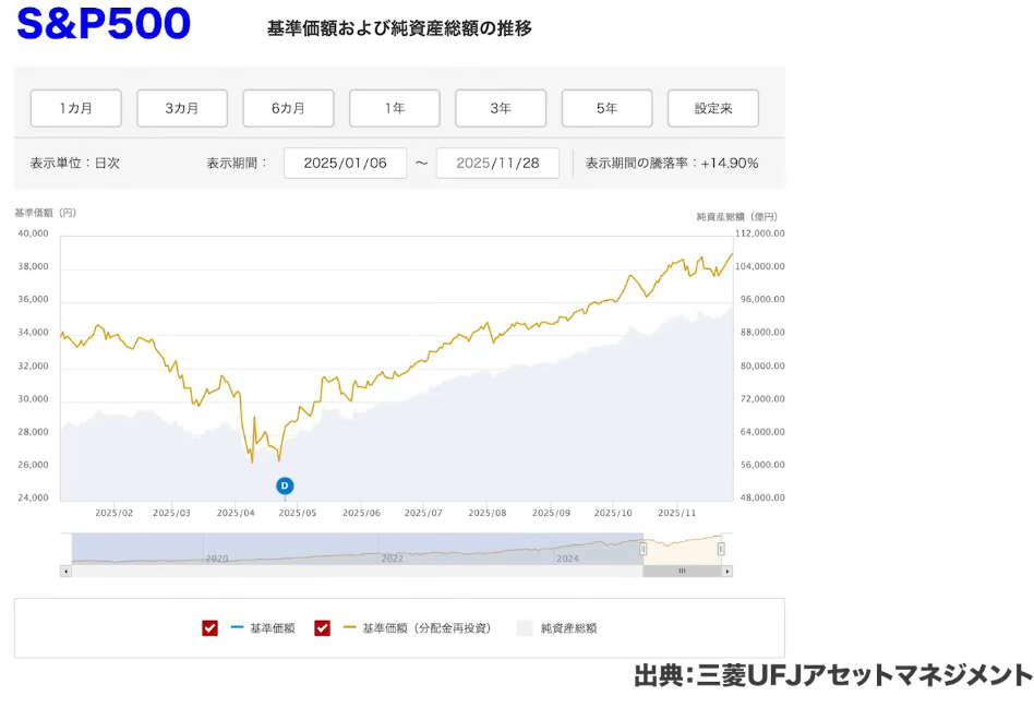 S&P500の年初の動きを見ると、左端部分で急激に跳ね上がっているようには見えません。基準価額にして数百円程度の変動で、3万4000円に対する数百円の動きです。