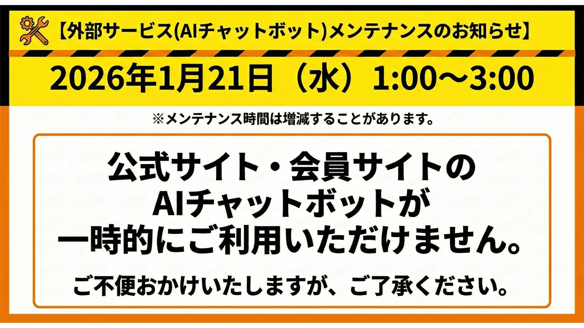 このたび、公式サイト及び会員サイトで利用している外部サービスである、AIチャットボット側のシステムメンテナンスが以下の日程で実施される予定です。