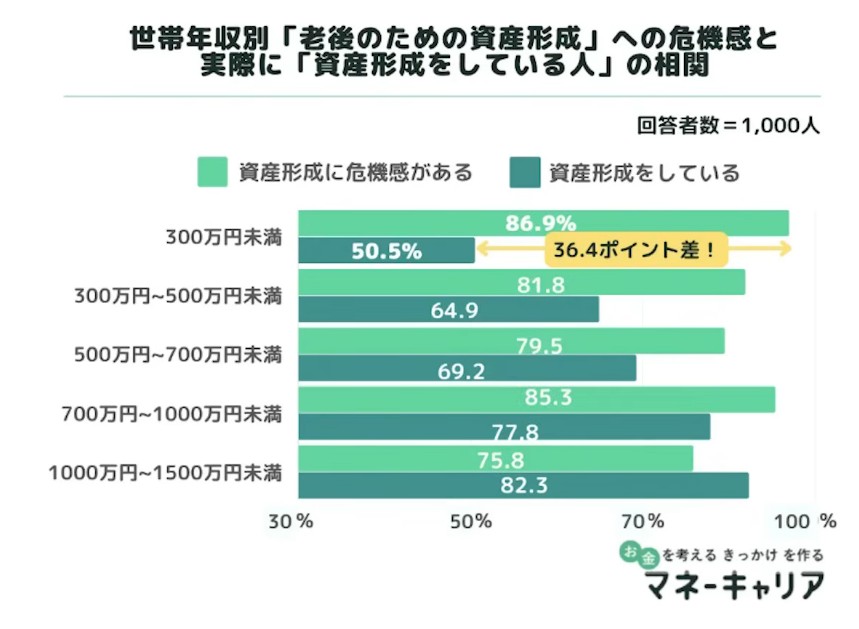 興味深いのは、高所得層に比べて低所得層の方が老後のための資産形成に危機感を感じているにもかかわらず、実際に資産形成をしている人の割合が低いという点です。世帯年収300万円未満の方でも、投資を実施している割合は50%に達しています。一方、年収が上がるにつれて危機感が薄れ、かつ実施割合も高くなっています。