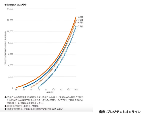 プレジデントオンラインの記事では、65歳からの年金額を100万円として、60歳から繰り上げ受給する場合は76万円など、4つの区分に分けて計算しています。運用利回り6%で計算した場合、60歳で受給した場合は100歳を超えても65歳受給に追いつかれないという計算になっています。