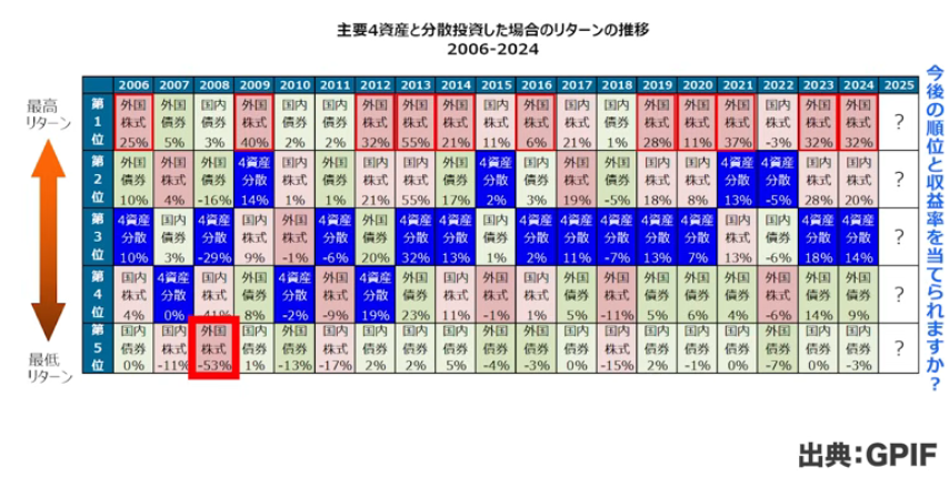 対策として資産分散が有効です。GPIFのデータを見ると、4分散で考えた場合、外国株式が成績良好で、トップを取っている年が多いことが分かります。ワーストは2008年のリーマンショックの時の1回だけです。1年間の騰落率で考えると半分以下になるかもしれませんが、安定的に増えていきます。リーマンショックの時はさすがに30%程度のマイナスでしたが、他の年はほぼほぼトントンか、2桁台のプラスが何年もあります。