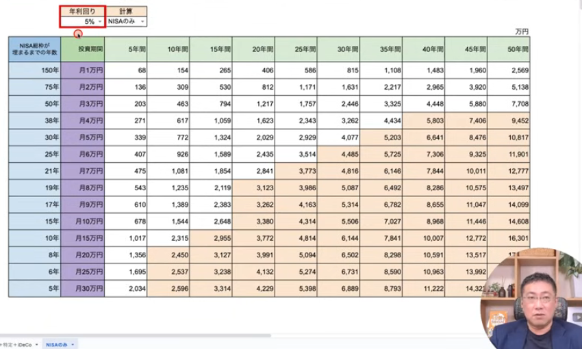今回用意した表は、NISAのみで投資をした場合に何年後にいくらになっているかを試算したものです。年利回りは5%に設定しています。全世界に満遍なく投資するアセットアロケーション運用の期待値は7%程度ですが、リスクが発生して上下を繰り返すと期待利回りから下がっていきます。できるだけリスクを減らして運用益を確保するという投資戦略が必要で、それでも大体2%程度下がる形になります。