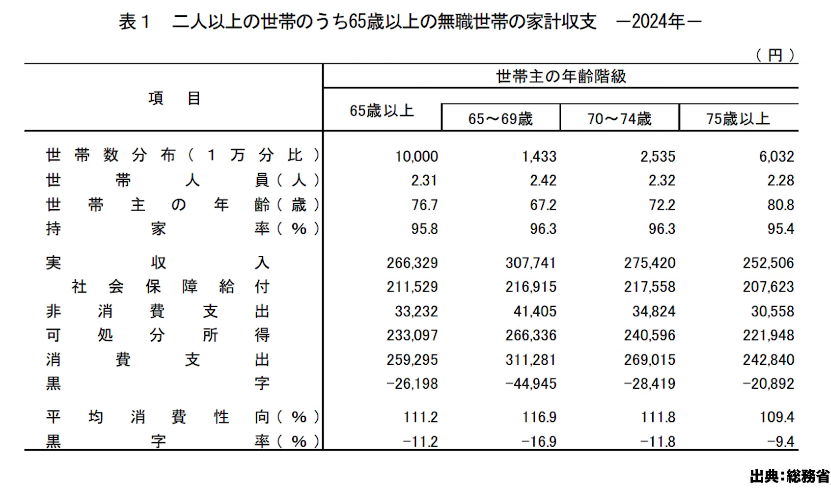 2024年の家計調査から、2人以上の世帯のうち65歳以上の無職世帯、つまり年金生活者の収支を見てみましょう。65歳以上をひとまとめにすると、月額2万6000円の赤字となり、これがいわゆる老後2000万円問題の根拠となりました。