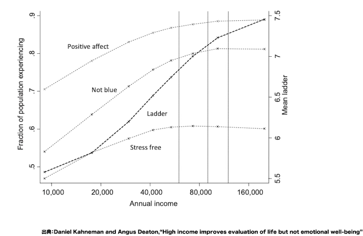 出典:Daniel Kahneman and Angus Deaton,”High income improves evaluation of life but not emotional well-being”