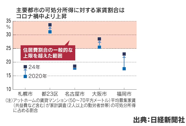 アットホームの賃貸データによると、2020年から2024年にかけて、家賃が可処分所得に占める割合は上昇傾向にあります。東京23区では31%台から33〜34%程度にまで上がっており、大阪でも25%から28%程度へと増加しています。