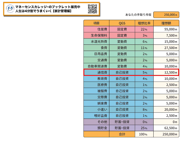 家賃はいわゆる「固定費」のひとつです。マネーセンスカレッジでは「QGS(クォーターグリッドシステム)」と呼ばれる家計の4分割管理を提唱しており、その中で家賃の目安は手取り収入の22%以内とされています。