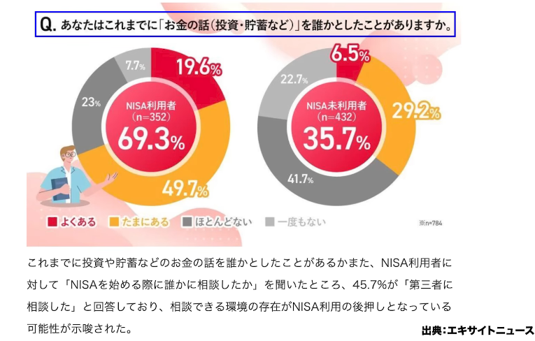 NTTドコモがマネックス証券と共同で実施したアンケート調査を紹介します。まず「お金の話(投資・貯蓄など)を誰かとしたことがあるか」という質問では、NISA利用者の69.3%が「よくある・たまにある」と回答したのに対し、NISA未利用者では35.7%にとどまり、約2倍の差がありました。NISA利用者は日常的に資産形成の話をする機会があるのに対し、未利用者にはそうした会話のきっかけが少ないことがわかります。