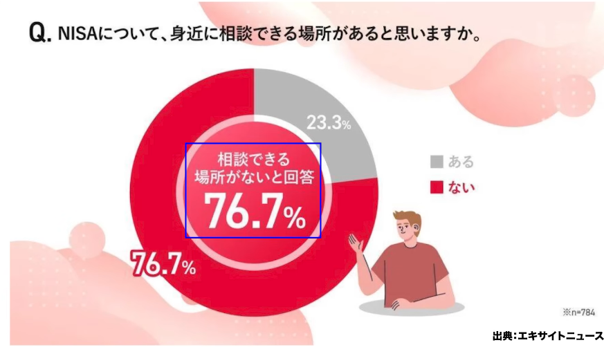 そして「NISAについて身近に相談できる場所があると思うか」という質問では、全体の76.7%が「ない」と回答し、NISA未利用者に限定すると82.6%が「相談できる場所がない」と感じていることがわかりました。さらに「相談できる場所が必要だと感じるか」という問いに対しては、52.3%が「必要だ」と答えており、多くの方が相談環境の不足を課題として認識していることが浮き彫りになっています。