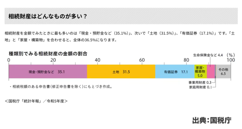 国税庁の令和5年度統計年報でも、預貯金が35%、土地が31%、有価証券が17%という割合となっています。