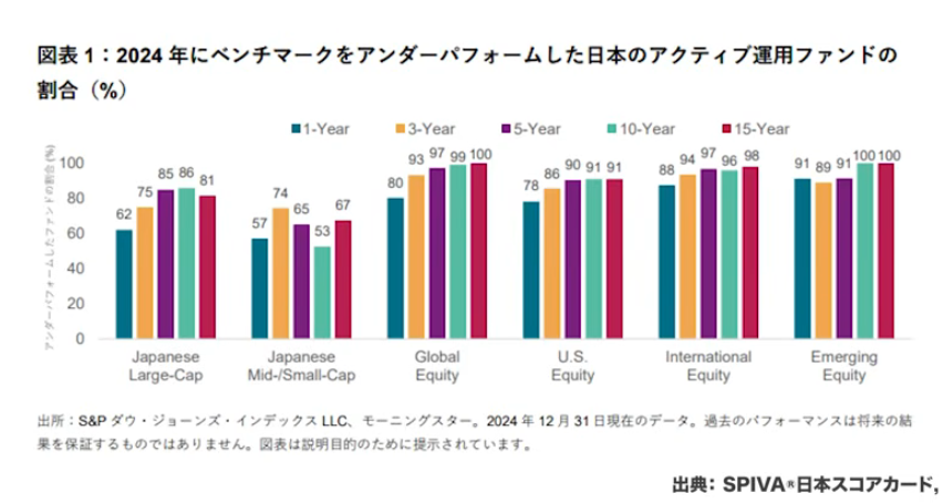S&Pが公表しているSPIVAレポートによると、2024年のデータでは15年間の運用成績において、グローバル株式のアクティブファンドの100%がベンチマーク(インデックス)を下回る成績だったことが示されています。日本国内のファンドでは若干成績が良く、それでも70〜80%がアンダーパフォームという結果です。