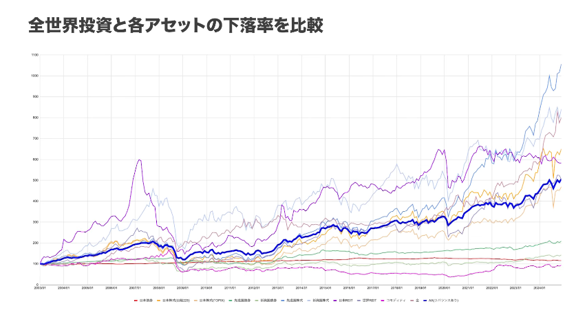 重要なのは、利回りを1%上げるためにリスクは約4%増えるということです。株式1本の運用はバランス型と比べてリスクが約2倍ある一方、リターンの上乗せは多くて2〜3%程度です。利回りを追い求めた結果、下落幅が大きく広がるリスクをとることになります。