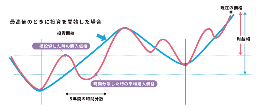 一括投資と時間分散を比較したグラフで考えてみます。たとえば相場のピーク近くで一括投資してしまった場合、その後5年間ずっとマイナスが続き、元の水準に戻るまでに5〜10年かかることもあります。一方で5年間にわたって分散投資した場合、ドルコスト平均法の効果により平均取得単価が下がり、結果として一括投資のワーストケースと比べて有利な水準で購入できます。