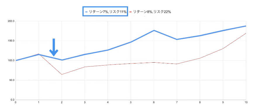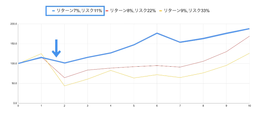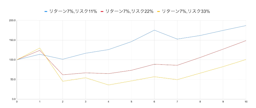 年平均リターンを7%に固定し、リスクを11%・22%・33%と変化させた価格推移グラフを見ると、リスクが低いほど最終的な資産額が高くなることが分かります。つまり同じリターンであれば、リスクを小さくした方が資産は増えます。