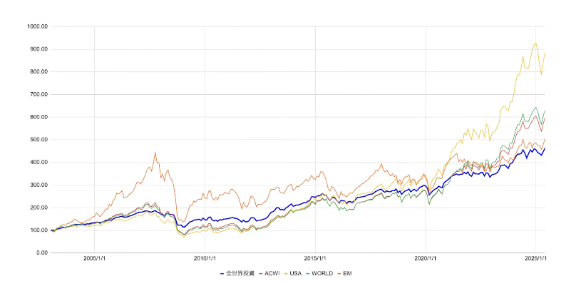 マネーセンスカレッジの全世界投資は、23年間の実績ベースで平均リターン7%・リスク11%程度です。オルカンは現在上昇トレンドが続いているためリスクが低く見えますが、米国株への依存度が高く、米国市場が大幅に下落すればリスクは跳ね上がります。過去のデータから見ると、株式一本の場合はどの商品であっても20〜22%程度のリスクを見込んでおくべきです。