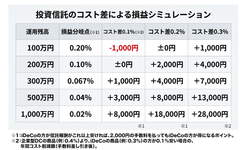 運用残高100万円の場合、信託報酬の差が0.2%以上あればiDeCoの方がお得です。200万円なら0.1%、300万円なら約0.067%、500万円なら0.04%、1,000万円なら0.02%が損益分岐点の目安となります。残高が大きくなるほど、わずかな信託報酬の差でもiDeCoが有利になるケースが出てきます。